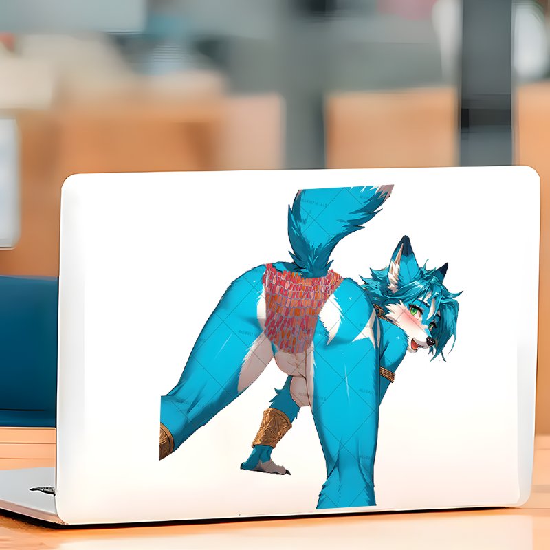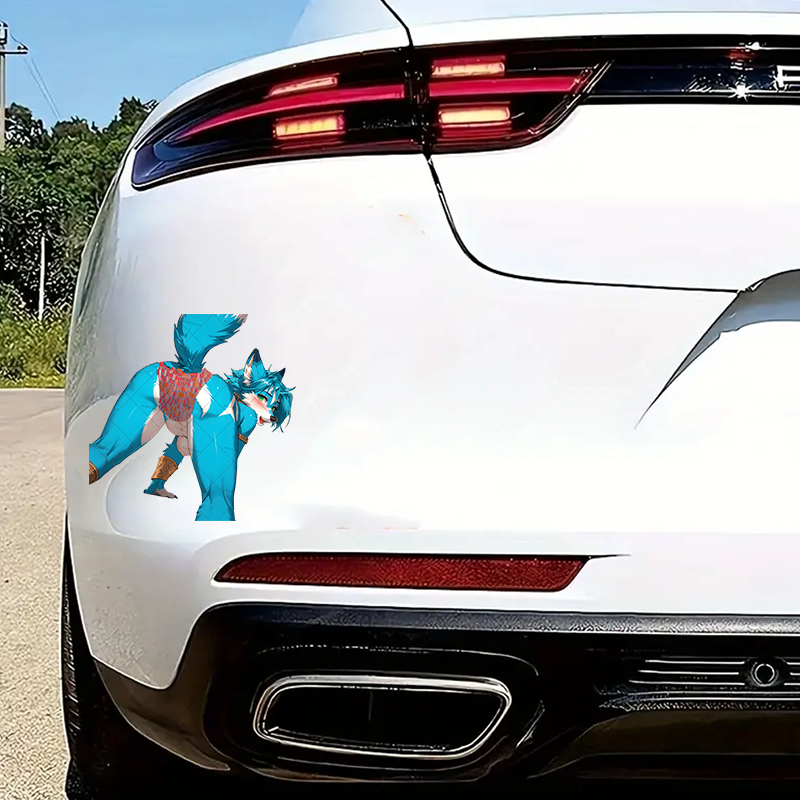 Blue Furry Leaning Over Car Sticker, durable and weather-resistant, perfect for outdoor gear and vehicles. Vinyl car decals suitable for cars, motorcycles, laptops, computers, backpacks, water bottles, and more.