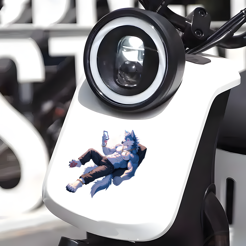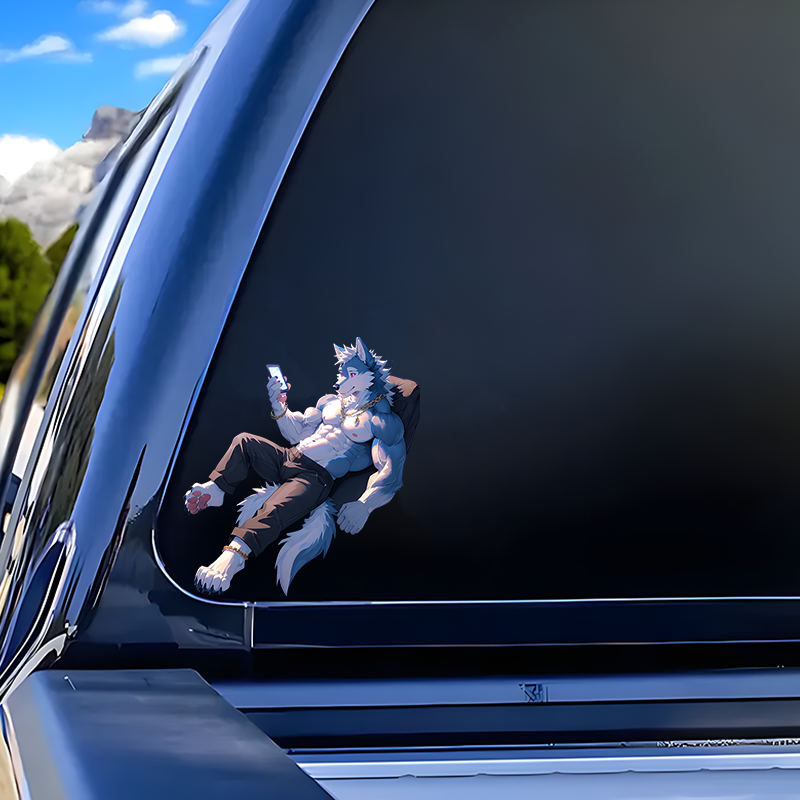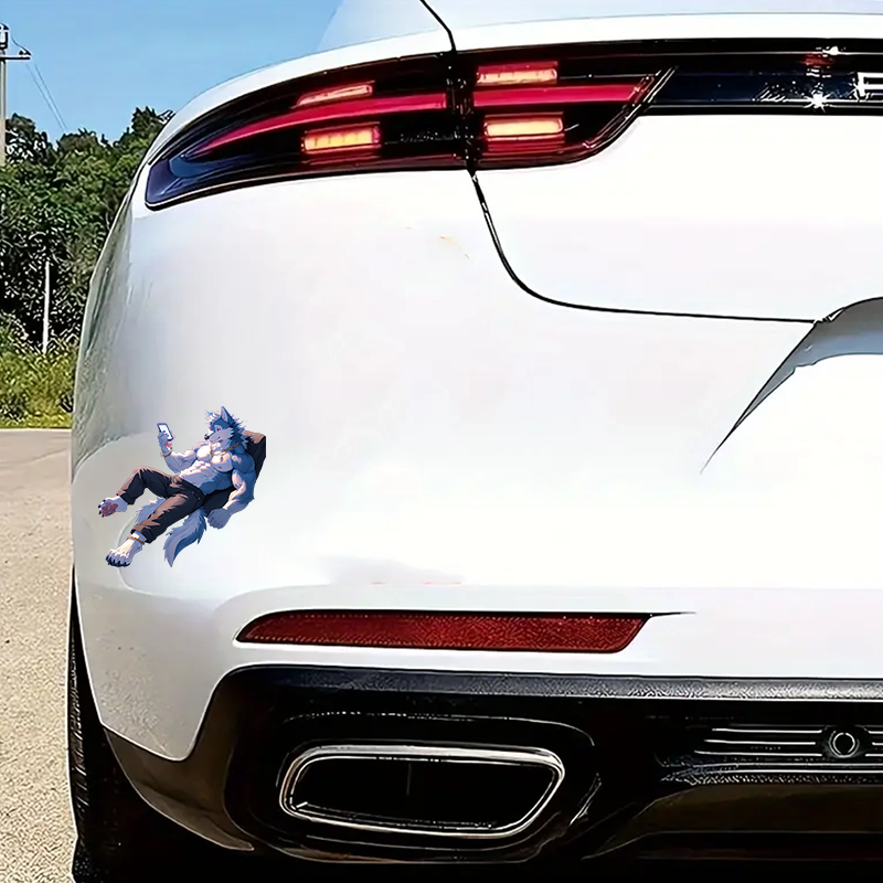 Muscular Furry Wolf Relaxing With Phone Sticker, residue-free removal, perfect for rented spaces and laptops. Vinyl car decals suitable for cars, motorcycles, laptops, computers, backpacks, water bottles, and more.