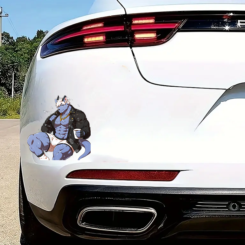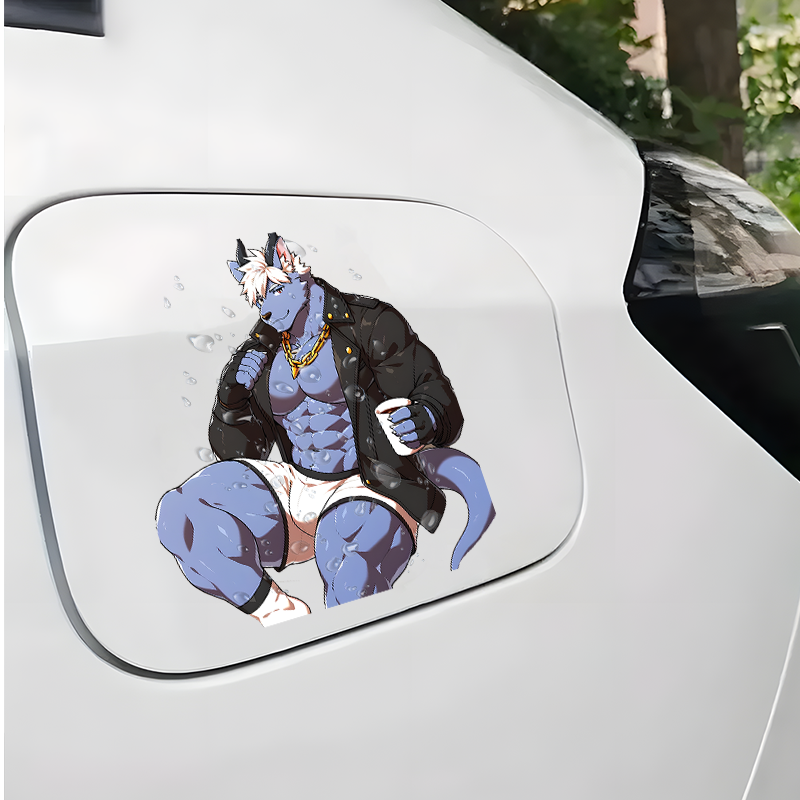 Muscular Furry Wolfman with Coffee Sticker, adheres well to plastic, metal, wood, glass, and ceramic surfaces. Vinyl car decals suitable for cars, motorcycles, laptops, computers, backpacks, water bottles, and more.