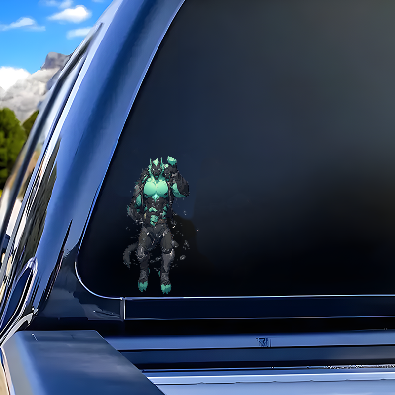 Three-Headed Wolf Anthro Muscle Car Sticker, perfect for gaming setups, PC towers, and console skins. Vinyl car decals suitable for cars, motorcycles, laptops, computers, backpacks, water bottles, and more.